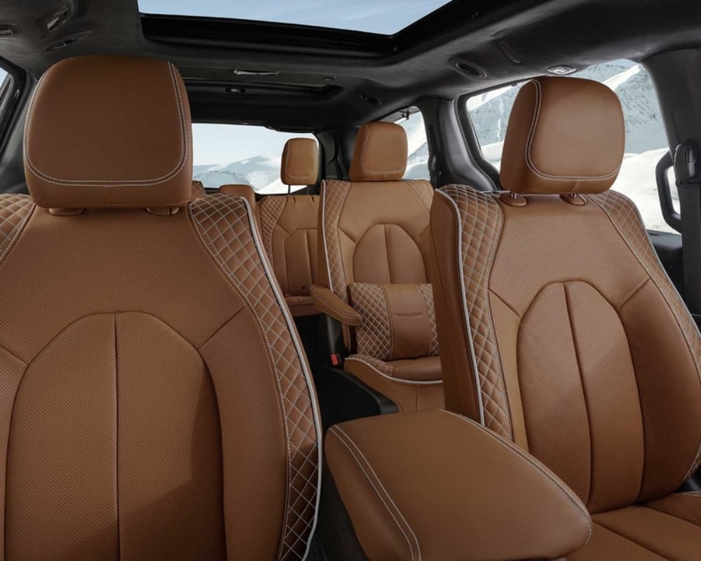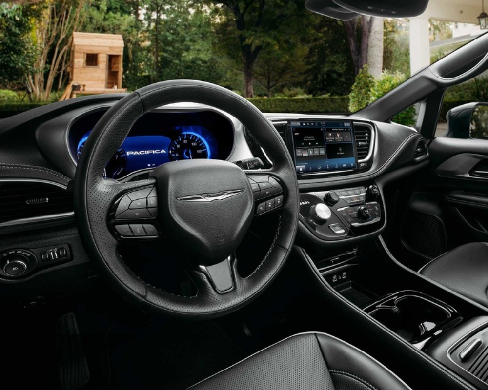 The Pacifica Hybrid’s interior blends premium materials with a spacious, comfort-focused design. Depending on the trim, seating options include cloth, leather-trimmed, or luxurious Nappa leather upholstery. The new Select trim features a second-row bench seat, accommodating eight passengers, while higher trims offer captain’s chairs for extra comfort.