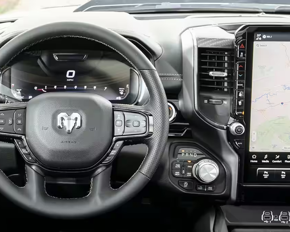 The 2025 Ram 1500 is a luxury pickup truck that emphasizes high-tech features that make life behind the wheel comfortable and enjoyable. The design includes a 12.0-inch or an optional 14.5-inch touchscreen that supports Android Auto and Apple CarPlay. The new touch screens include modern features, including better response time, faster performance, and a more user-friendly design. The passenger display, measuring 10.25 inches, is an added perk for entertainment and navigation functions.
