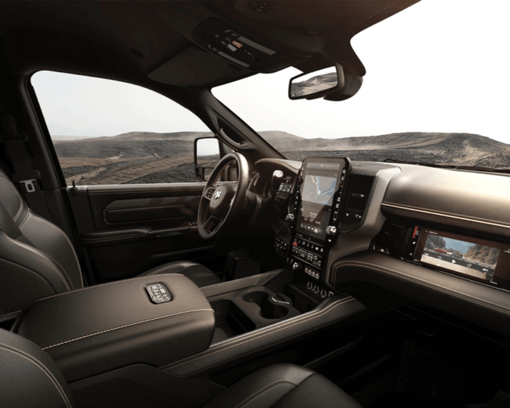 Inside, this workhorse blends ruggedness with refinement. Depending on trim, buyers can choose from durable cloth to premium leather with wood accents. Flexible seating options include 40/20/40 split-folding front benches, reclining Mega Cab rear seats, and clever storage solutions like the Class-Exclusive fold-flat load floor and in-floor Ram bins.